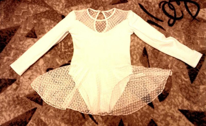 Гимнастический купальник,белый,с короткими рукавами и юбочкой.Размер 116.х.б.