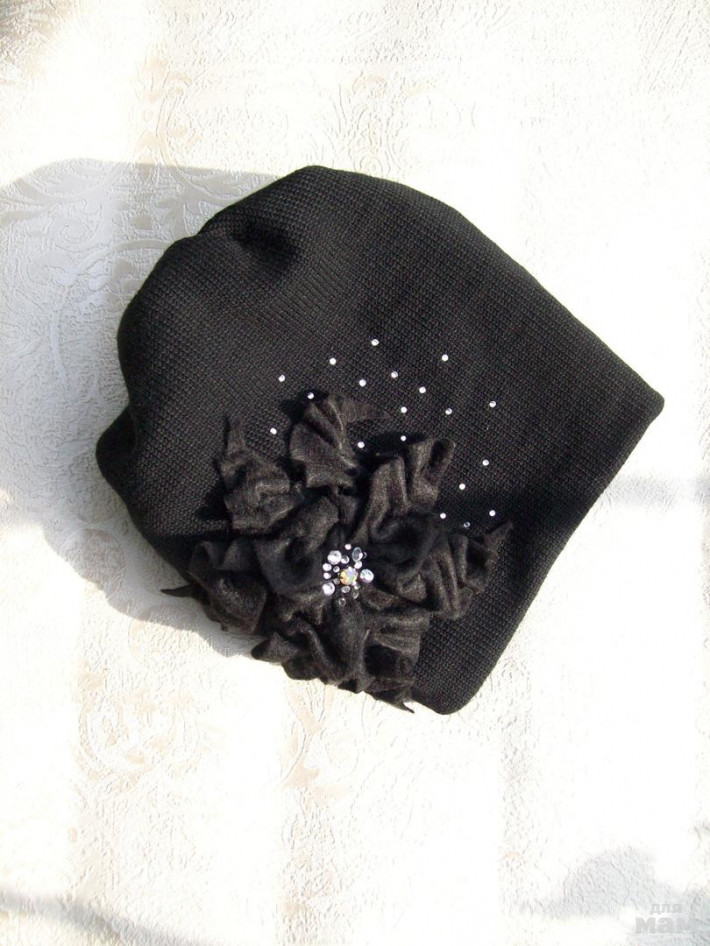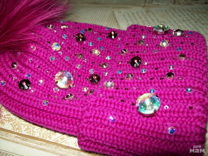 Черная. Меринос нежнейший. В два слоя. Можно довязать ушки по желанию. Помпон - финский черный енот 20-21 см. Фото сделано при дневном свете, поэтому не передает переливания страз.