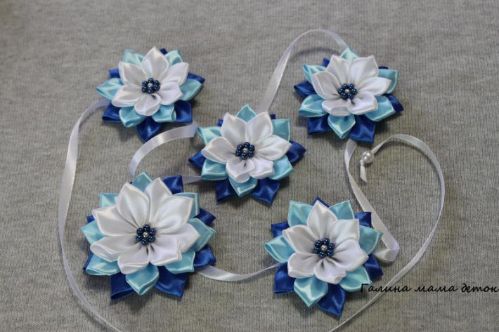 Лента в косу школьная из 5 цветов. Первый цветок крепится на зажиме и немного большего размера. 4 цветочка подвижны.