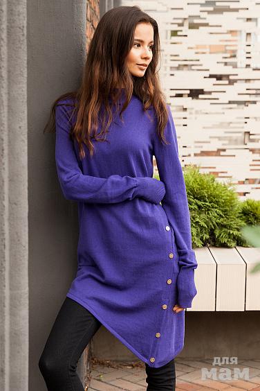 Платье-свитер прямого кроя выполнено из мягкого хлопкового трикотаж. Модель с о спущенным плечом и воротником-стойкой. Спереди по центру рельефный шов, по бокам разрезы.