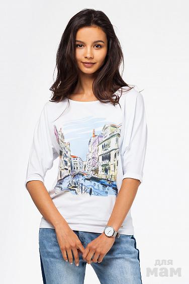 Футболка по подолу с бахромой, рукав-фонарик, декорирована красочным принтом и блестками.