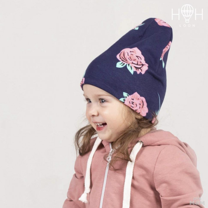 1) ШВ19-05881290 Двухслойная удлиненная трикотажная шапка с принтом, розы/темно-синий , 370р 333р+15%=382,95