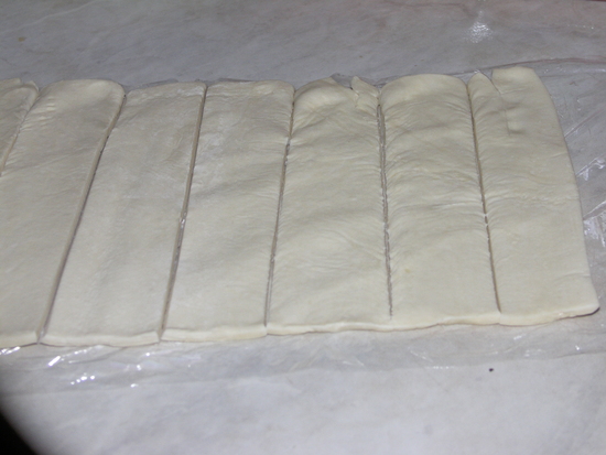полоски могут быть разной ширины, все зависит от вашего настроения) потом раскатать тесто немного