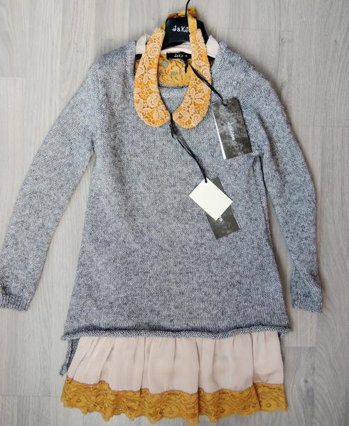 внутренн.платье (50%хлопок, 50%вискоза) + верхнее платье чехол (55%полиэстер,45%шерсть). Мягкое, не колется, не мнется. Размер 9 лет Дополнительно есть воротник из этой же коллекции, отдам за 950 руб к платью.