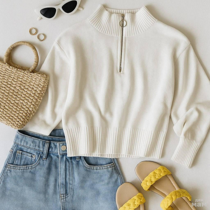 Слегка укороченная базовые кофточка идеальна для аутфитов со штанами с высокой посадкой.