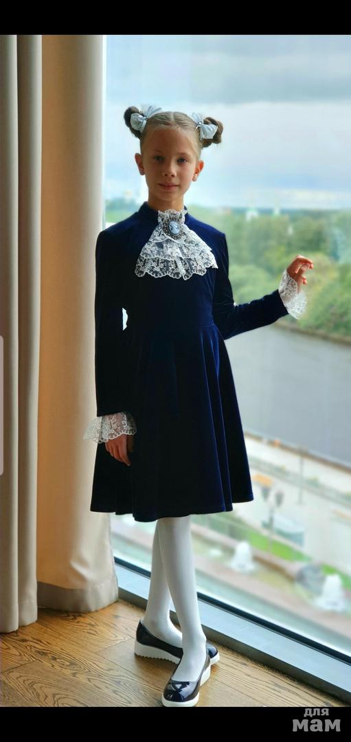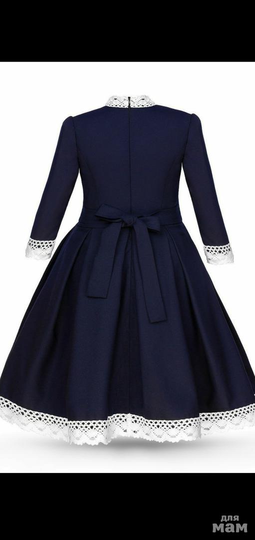 Очень красивое школьное платье , на подкладе х/б. Сидит очень хорошо.Не жаркое . В идеале. Размеру 146-152 соответствует.