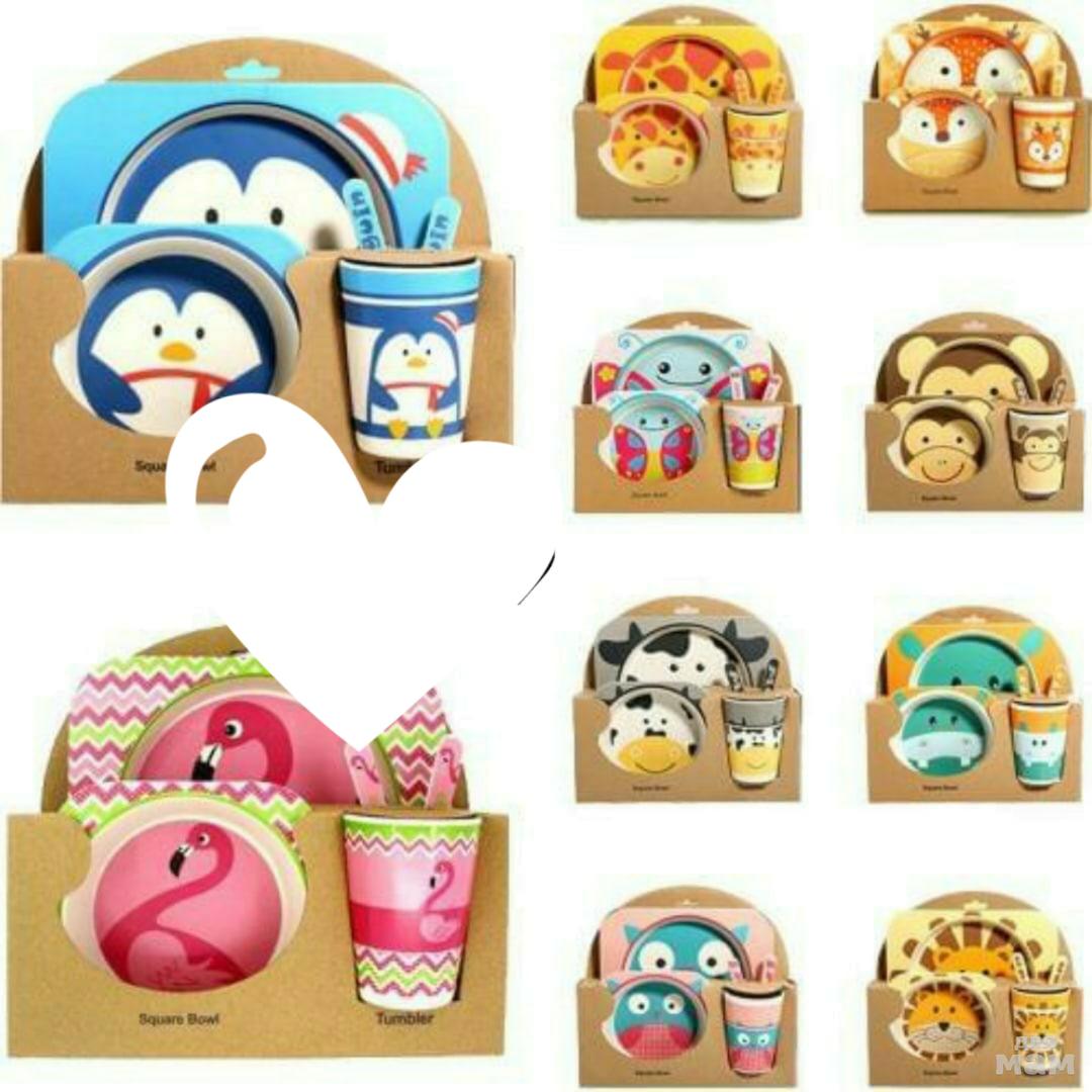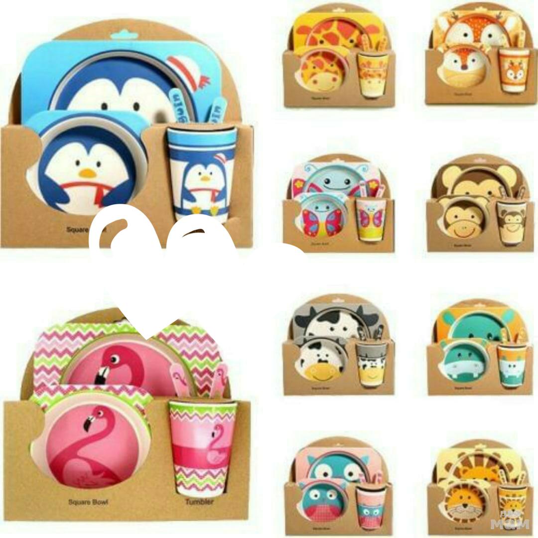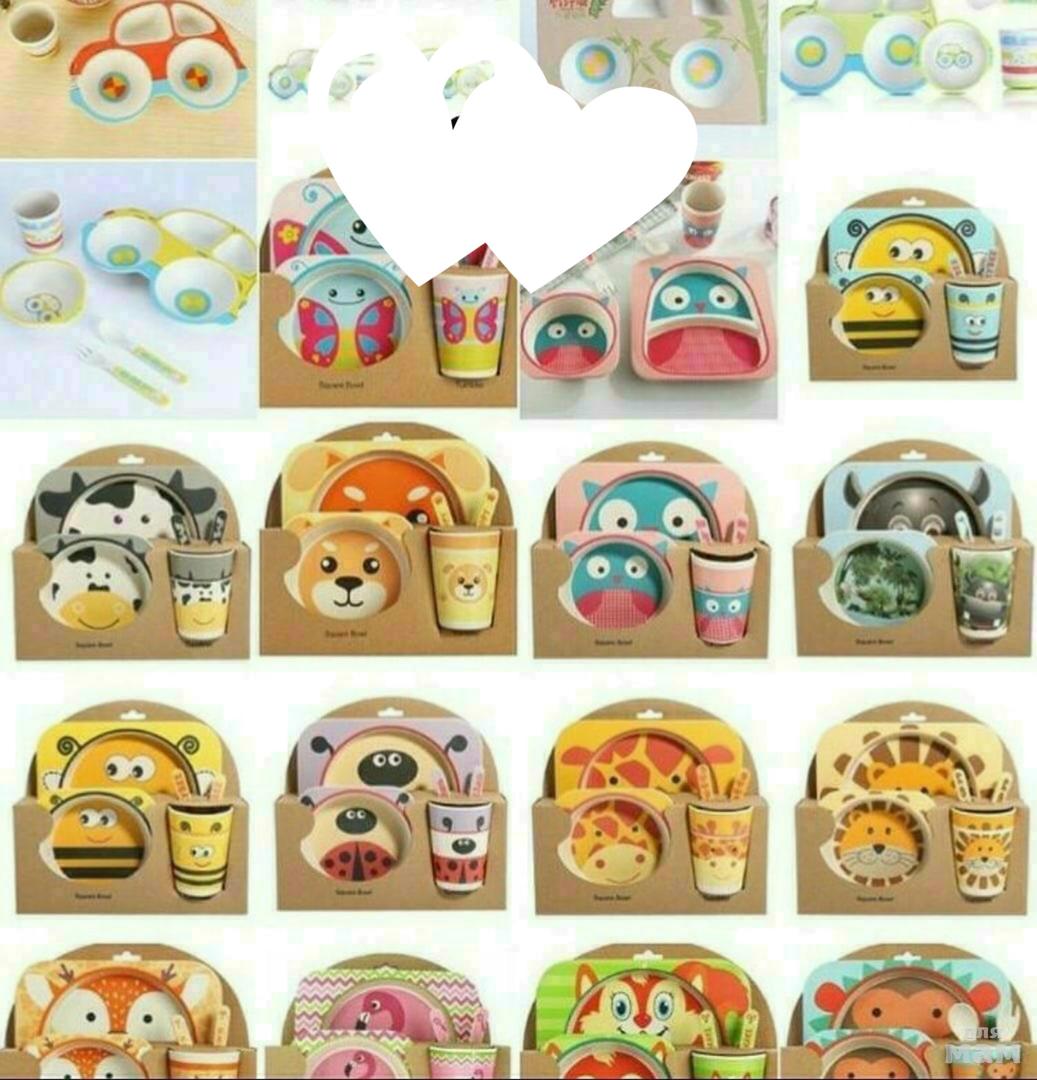 Детская посуда из бамбука. Набор состоит из 5 предметов: -большая тарелочка с двумя отделениями -маленькая тарелочка -стаканчик -вилка -ложка Такой набор обязательно заинтересует вашего малыша и процесс кормления станет в разы проще.