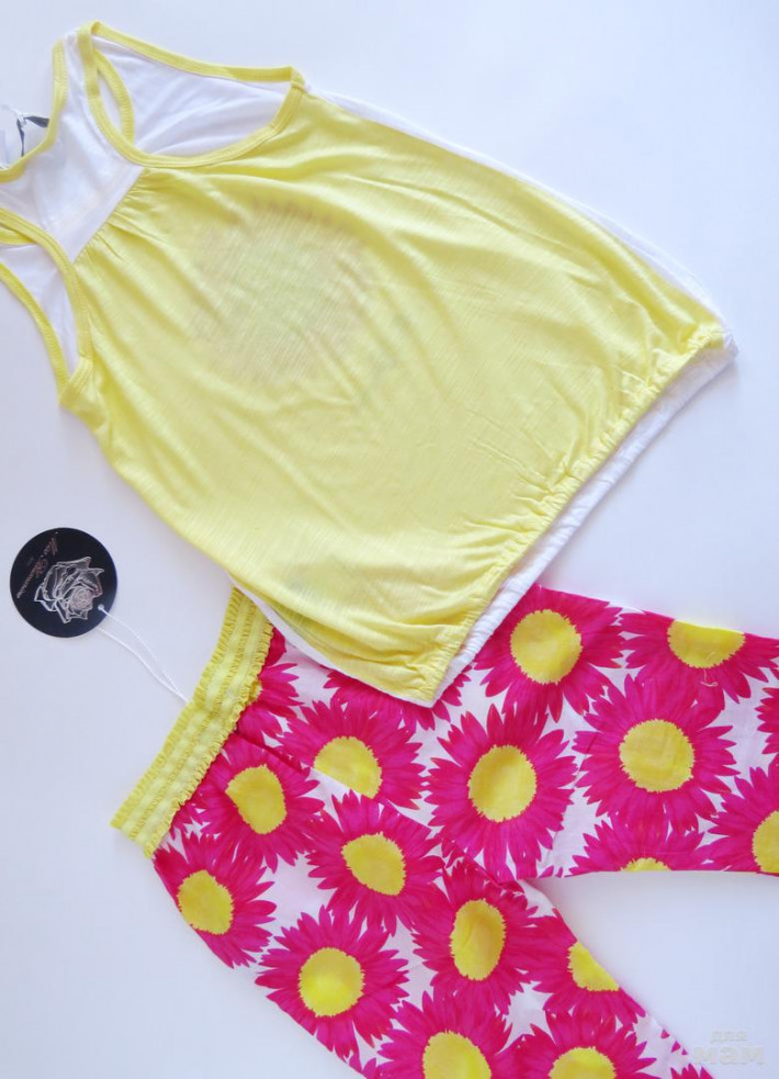 Состоит из нижнего топа - маечки ярко-малинового цвета и верхнего, свободного, белого , с малиновой отделкой