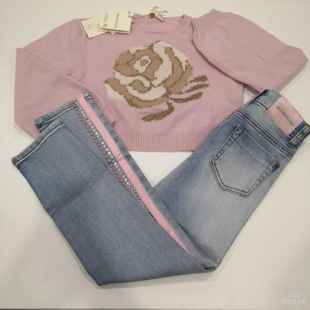 Нежнейший, потрясающий сет MONNALISA. Джинсы из мягкого денима с лампасами из бусин. Размер 7 лет, цена 9400 рублей. Джемперок из шерсти с кашемиром, мягчайший, не колючий. Размер 10 лет, цена 8800 рублей.