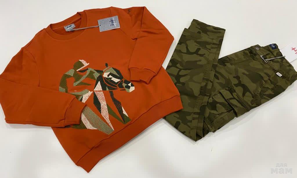 IL GUFO, свитшот, цвета терракот. Размер 10 лет, цена 7990 рублей. Брюки камуфляжные, размер 10 лет. Цена 7250 рублей.