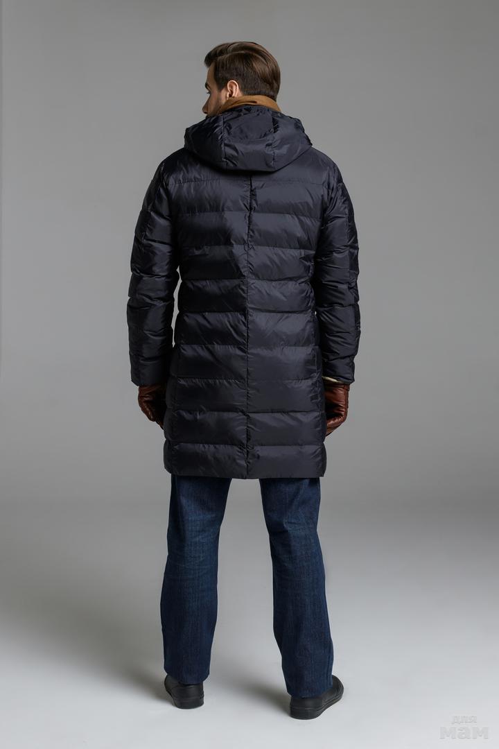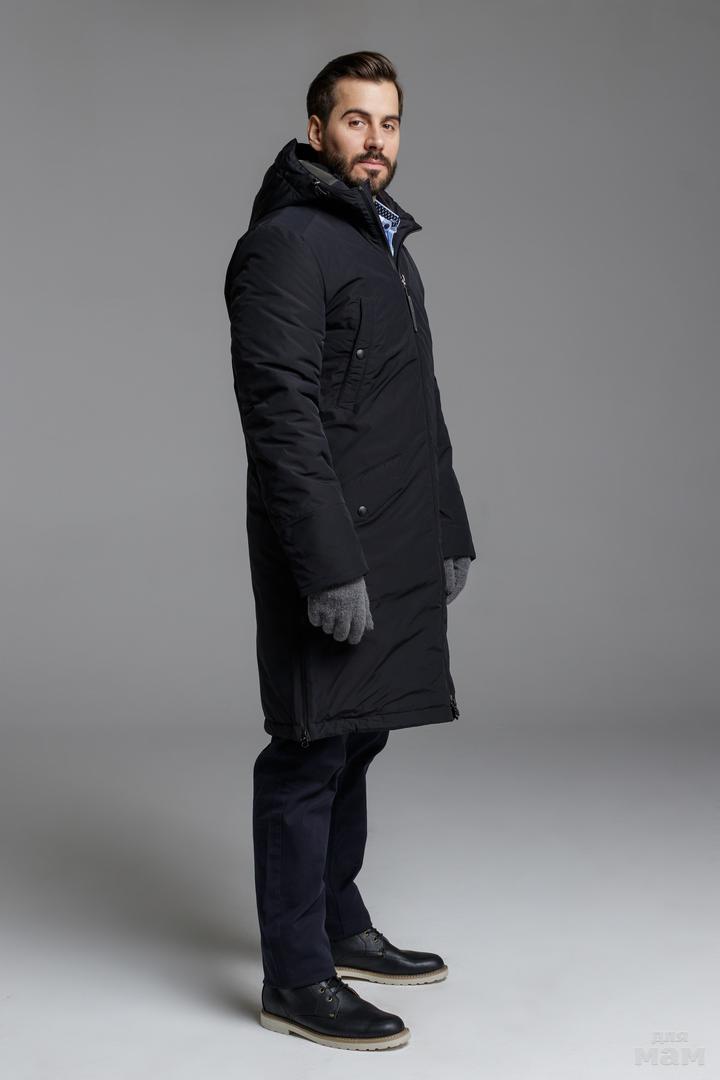 Мужская зимняя удлиненная куртка, прямого силуэта. Центральная застёжка на молнии с внутренней планкой и внешней ветрозащитной планкой на кнопках. Воротник - стойка отделан с внутренней стороны тканью под "замшу". Съёмный утепленный капюшон, регулируется по овалу лица кулиской с фиксаторами. Нагрудные карманы "в рамку", застегиваются на кнопку. Нижние карманы накладные с клапаном на кнопке с дополнительным боковым входом. Рукава втачные, двухшовные, внутри рукава манжета из трикотажа. Дополнительные молнии внизу боковых швов для комфортной носки. Два глубоких внутренних кармана.