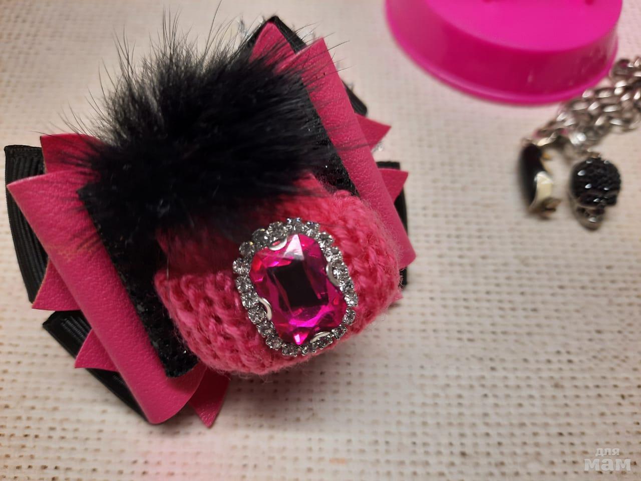 2) Одиночный бантик в модном сочетании фуксии и черного. Экокожа и норочка. Размер бантика 7см.