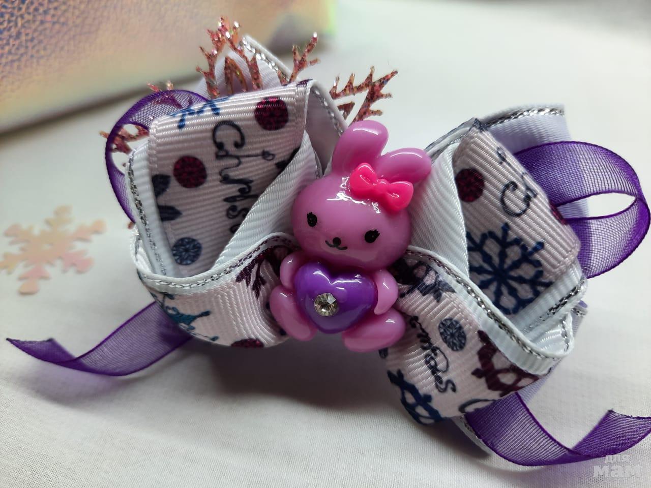 4) Зимние зайчата в нежном сиреневом цвете. Основа на бантиках резиночки. Размер 7 и 5 см.