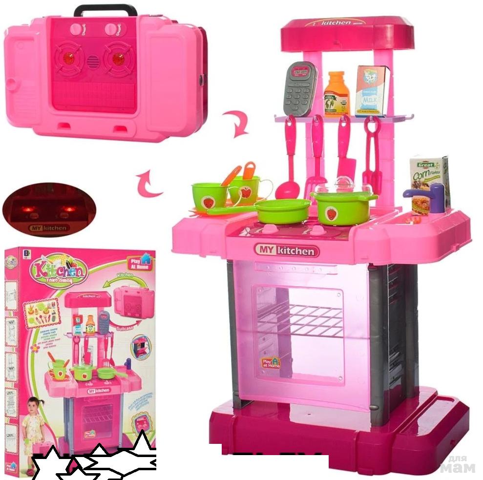 В комплекте присутствуют различные столовые приборы, а также кастрюли и сковородки. В детской кухне также имеется духовка, дверцу которой можно открыть. При повороте ручек для включения конфорок можно активировать эффекты со светом на плите, а также звуковые - в духовке.