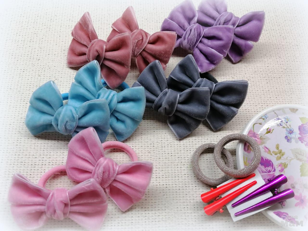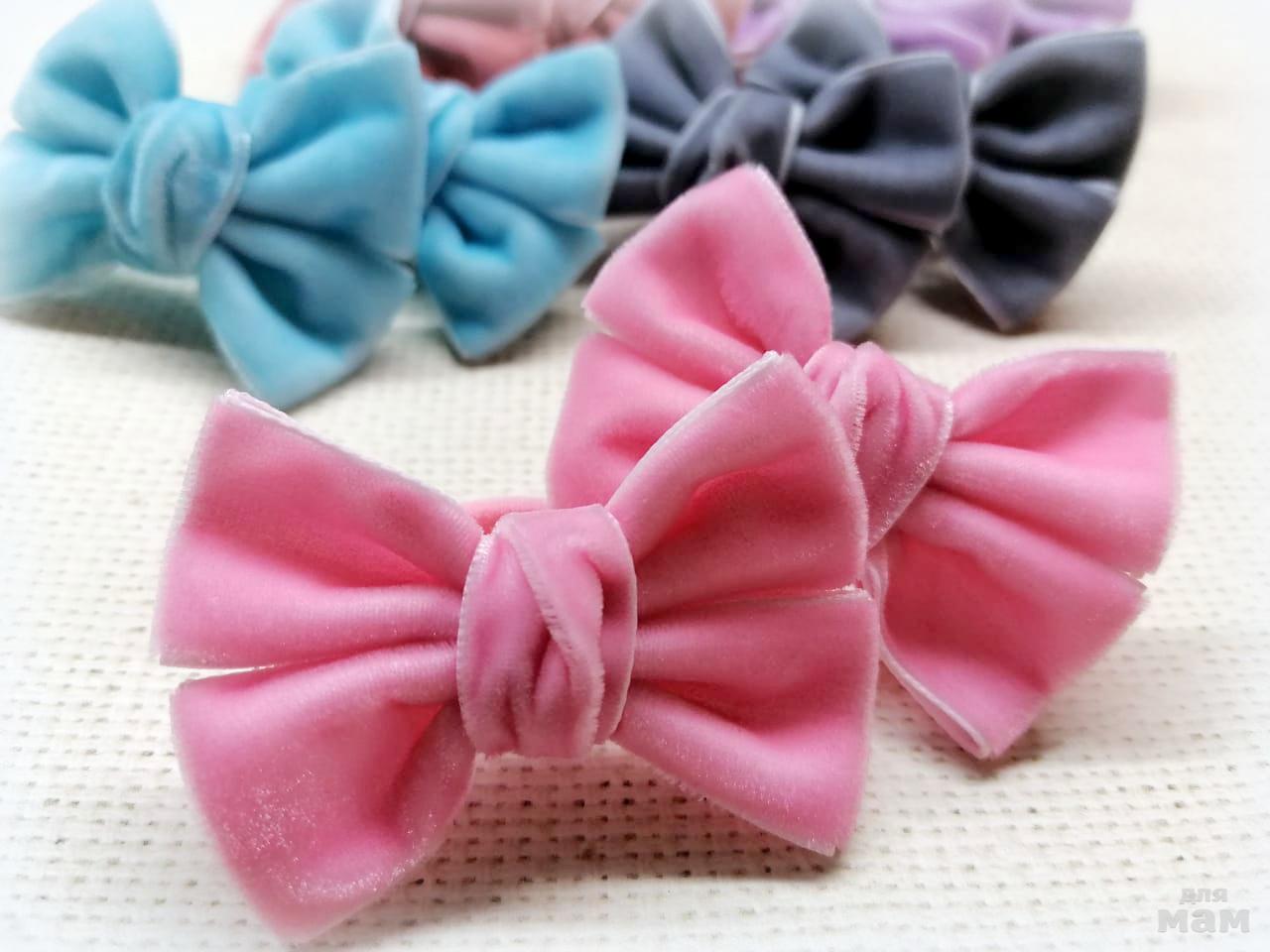 1) Сочные краски для яркого образа. В наборе бархатные бантики пяти цветов : желтый, красный, синий, зеленый, белый. Размер бантиков 6 см. Все с резиночками в тон.