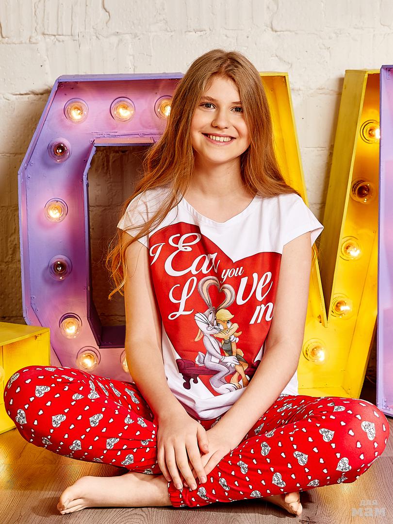 113. Комплект фуфайка (футболка), брюки жен Crazy Getup by Juno "Looney Tunes" AW20GJ0513 белый/красный/рисунок цена 1050р