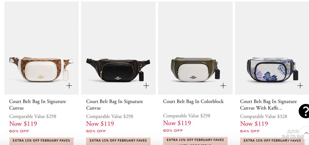 Выбираем по ссылке https://www.coachoutlet.com/deals/extra-15-off-february-favorites/#srule=price-low-to-high&start=0&sz=16
