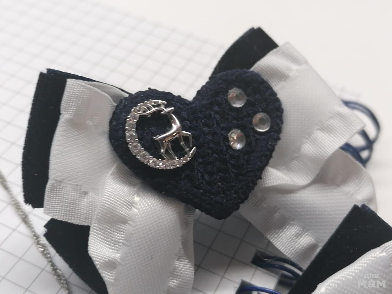 2) Бантики на косички. Бархат. Цвета - белый и темно-синий. Олень ювелирный, месяц весь усыпан стразами, "звезды" - термо стразы. Размер бантиков 6,5 см
