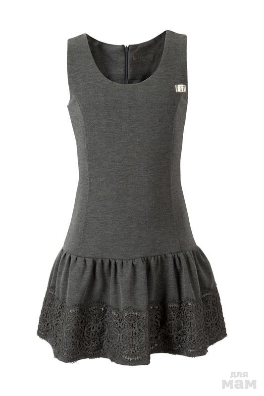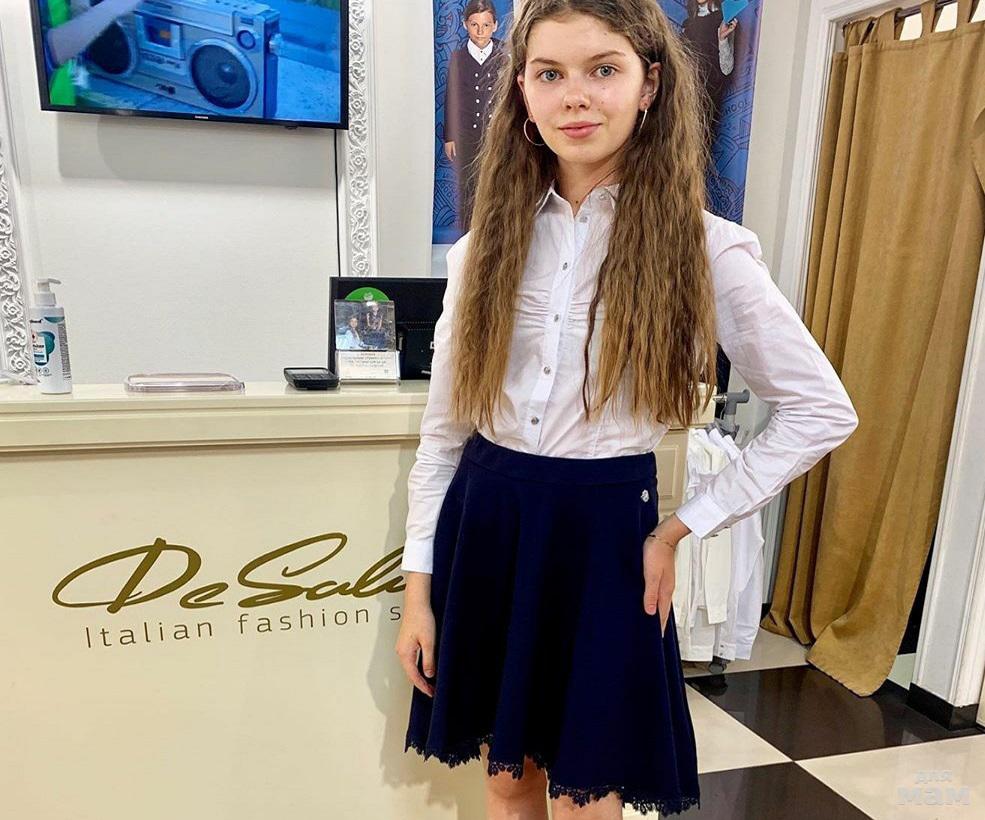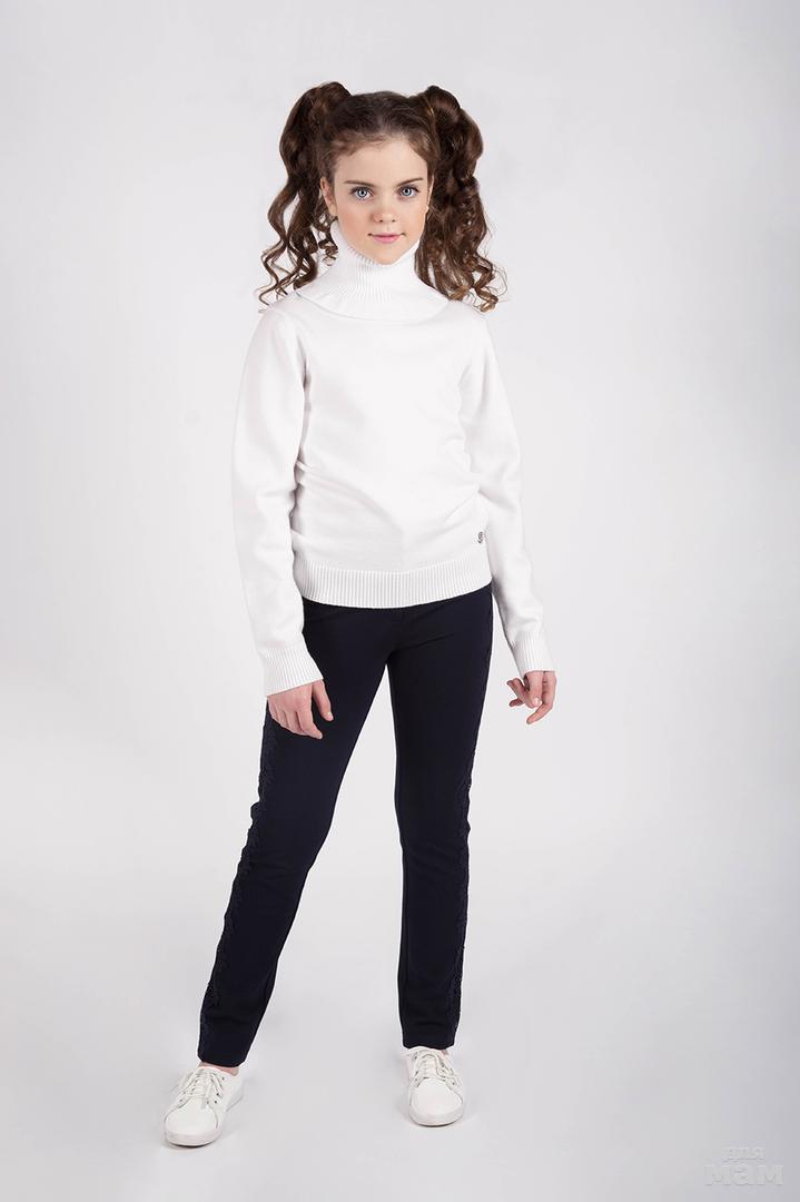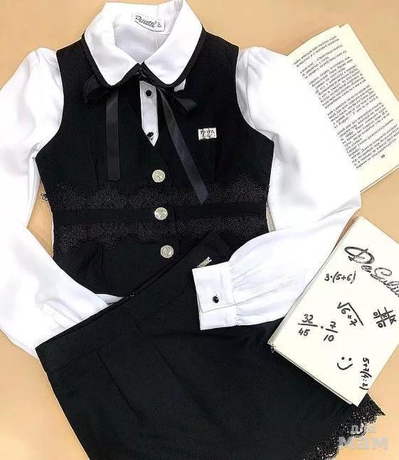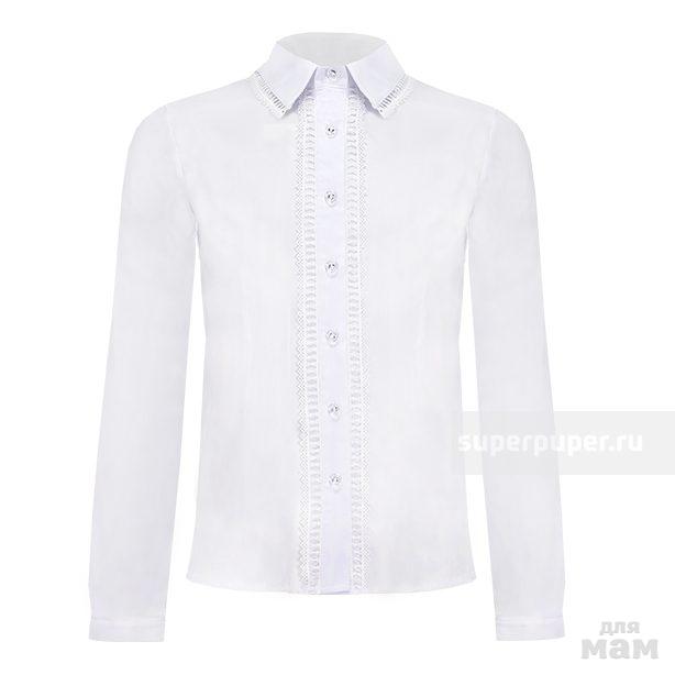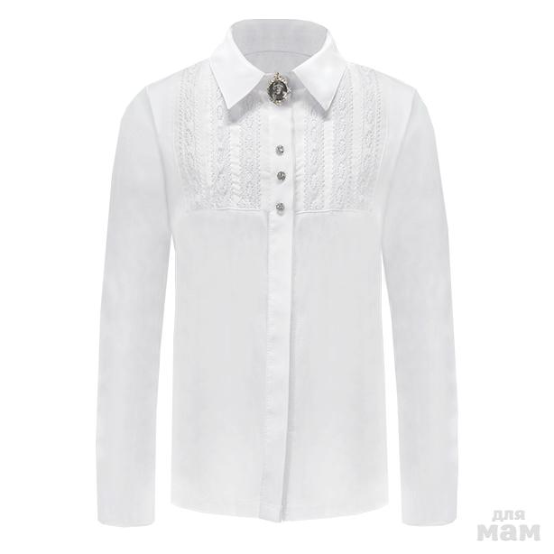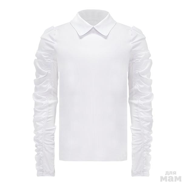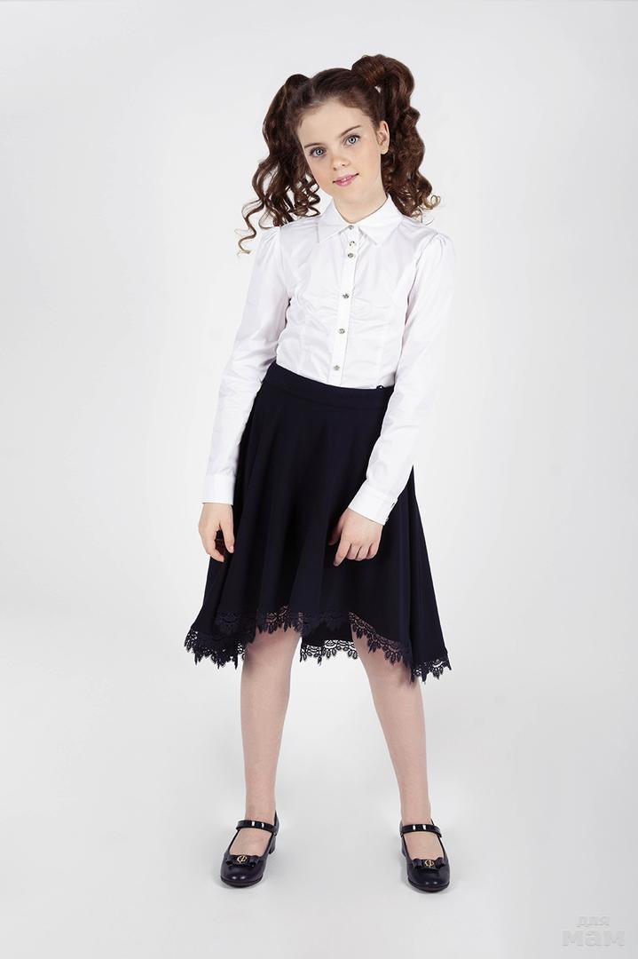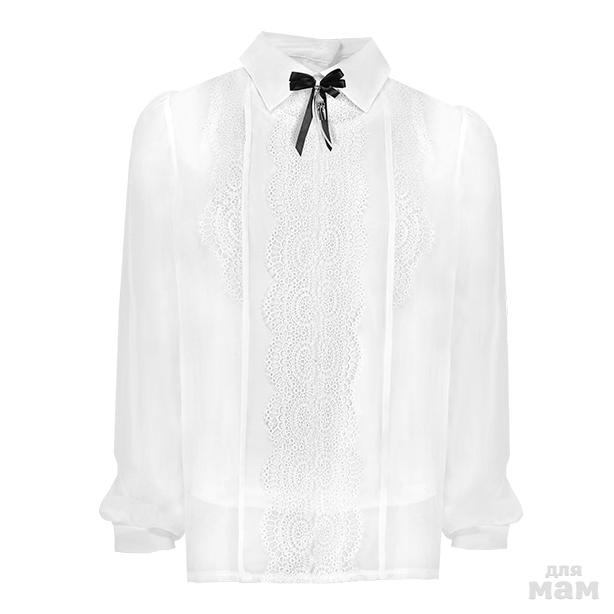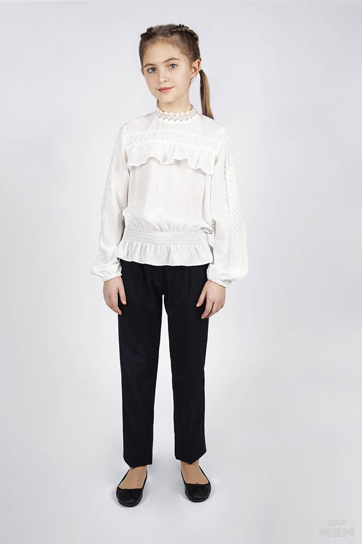 Блузка из трикотажа с коротким рукавом, с отложным воротничком, кокетка на полочке декорирована гипюром и рюшами. Небольшой бант-лента под воротником.
