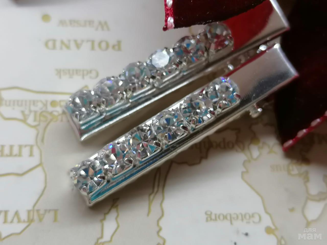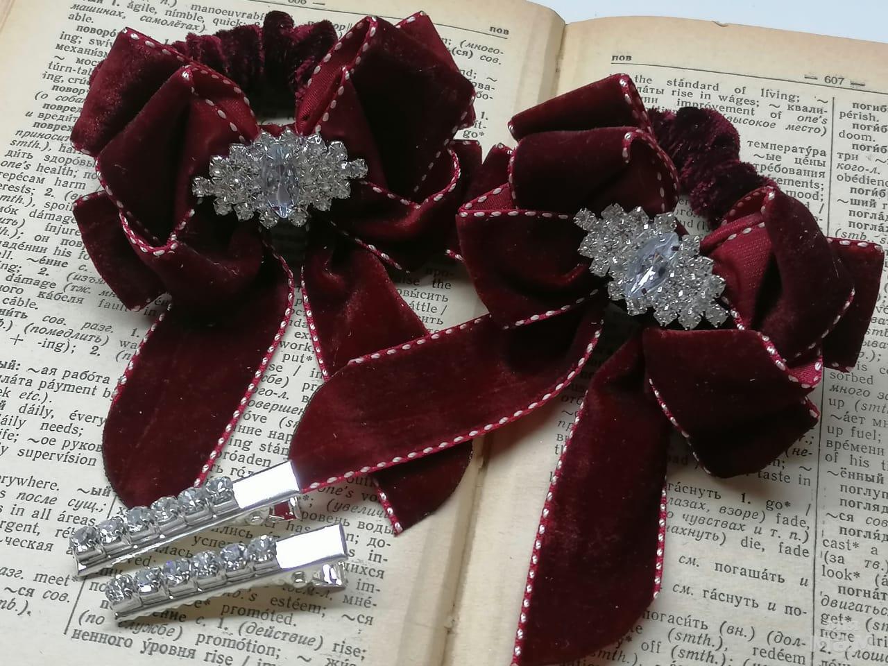 Бархат, только бархат и ничего кроме бархата. Даже резиночка бархатная в тон. Заколочки в подарок к комплекту. Набор оооочень красивый, стильный, благородный.