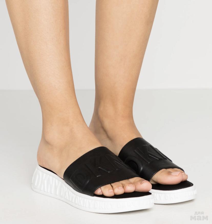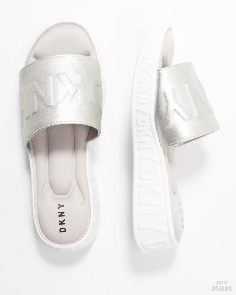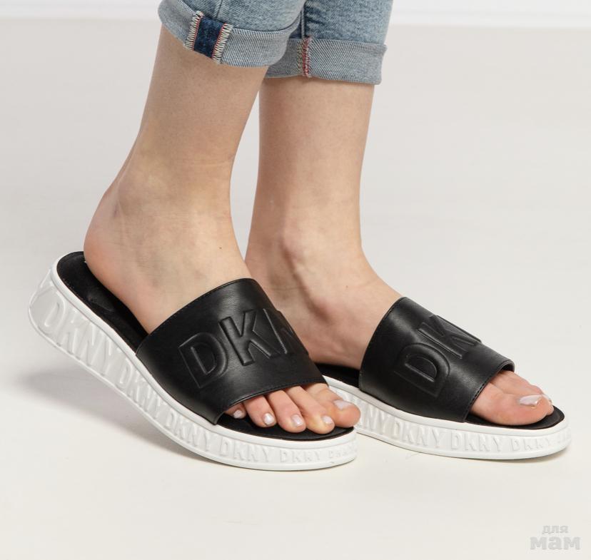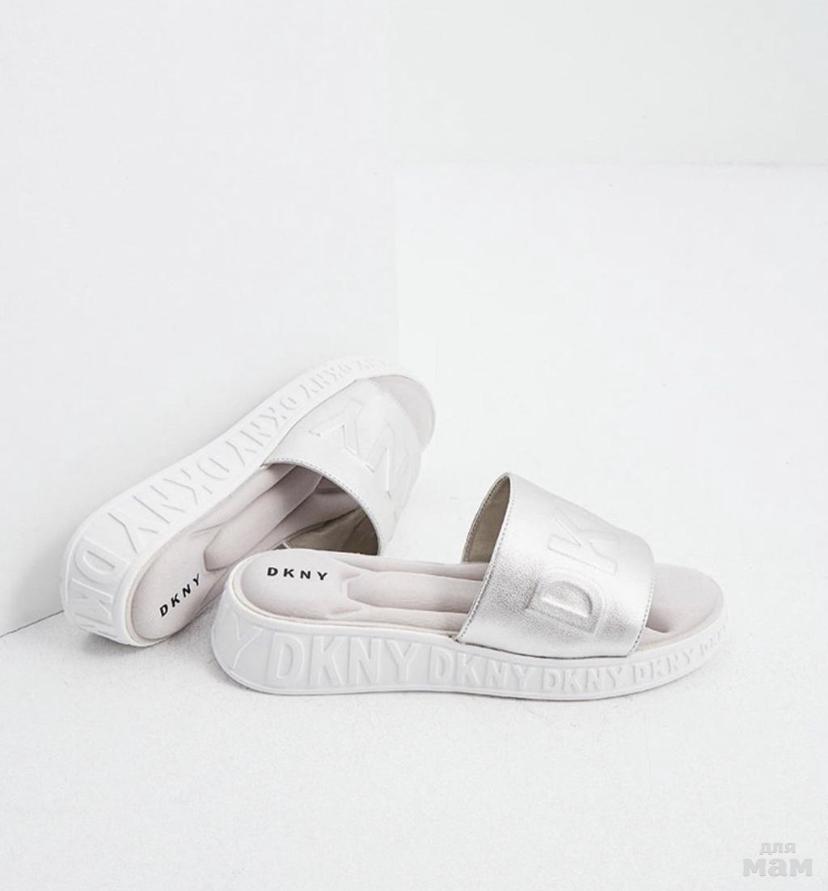Сандалии от DKNY имеют один широкий рельефный ремешок со смелым каблуком на платформе, усыпанным контрастной графикой логотипа для поразительного эффекта.