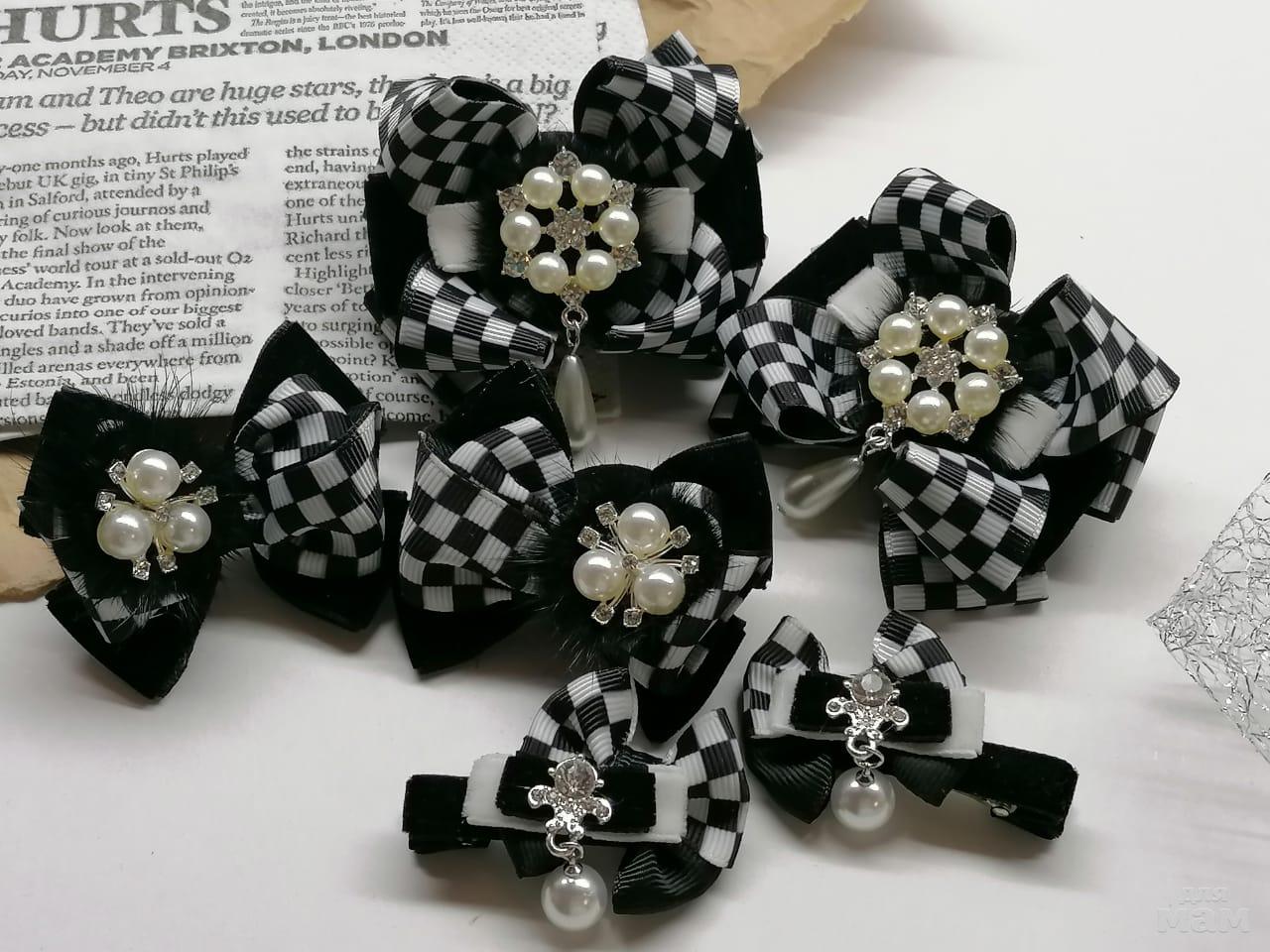 1) Я не могла пройти мимо этой ленты. Шикарная клетка, шикарный набор. Новая моделька бантика, жемчужинки, норочка, бархат - в нем все идеально! В наборе два размера бантиков (7см и 5 см) и заколочка.