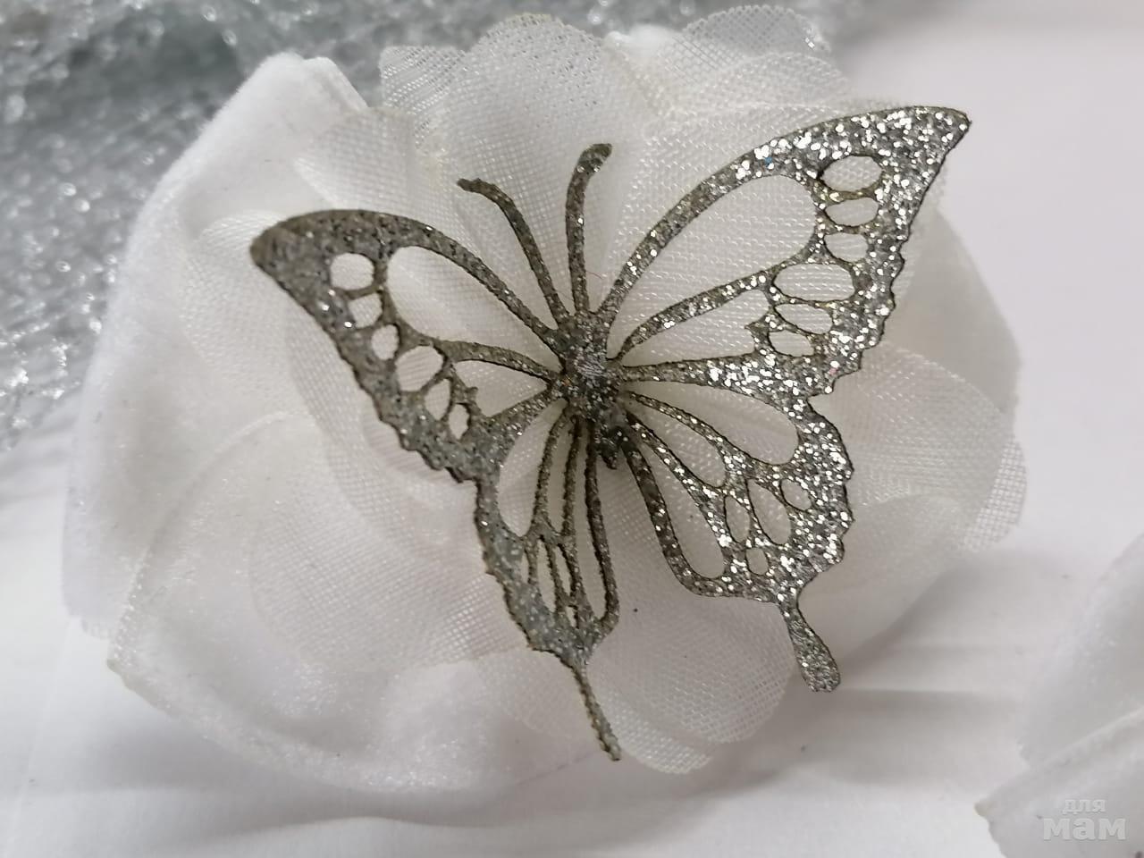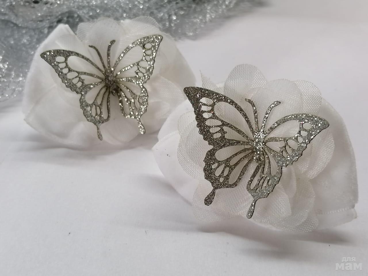 Бархатные маленькие бантики с бабочками на воздушном цветочке. Размер бантиков 6,5см. Бабочки - вырубка из глитерной кожи. Не осыпается. На солнце переливается просто невероятно и смотрится тонким ажурным кружевом. Очень нежные, а за счет бархата еще и очень благородные!