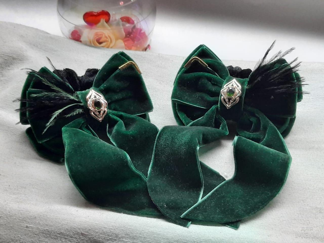5) Строгие нарядные изумрудные бантики на бархатной резинке и ювелирном кабошоне. Уголок и перья дополняют образ. Большие. На выход. Кто помнит и брал под Piccino Bellino