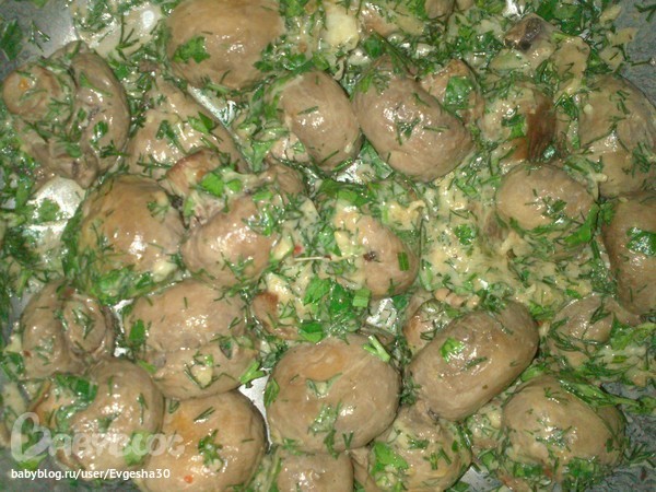 Моем шампиньоны (1 кг),кладем в кастрюлю туда же приправу для грибов (либо те которые вам нравяться-я делала и с "тушим овощи" и со всякими разными) можно добавить чуть майонеза или сметаны и оставить часа на 2 минимум(я и на ночь оставляла) в холодильнике.Потом выкладываете на противень и запекаете(я запекала в электрической духовке на режиме верх+низ) 240 градусов - минут 30 (по ним видно как они поджарятся)...