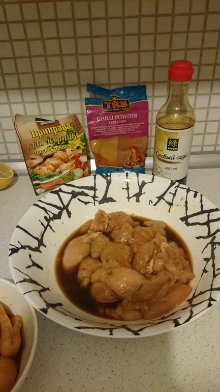 Куриную грудку режу на кусочки толщиной сантиметра полтора, можно крылышки еще на три части разрезать и мариную в соевом соусе и приправе для курицы, плюс добавляю острый перец