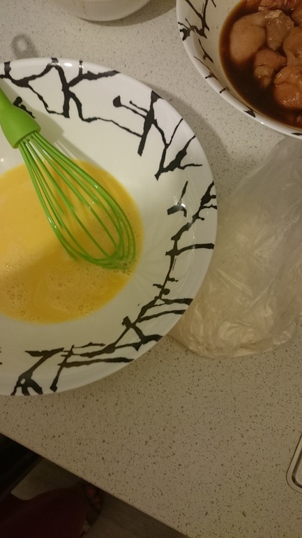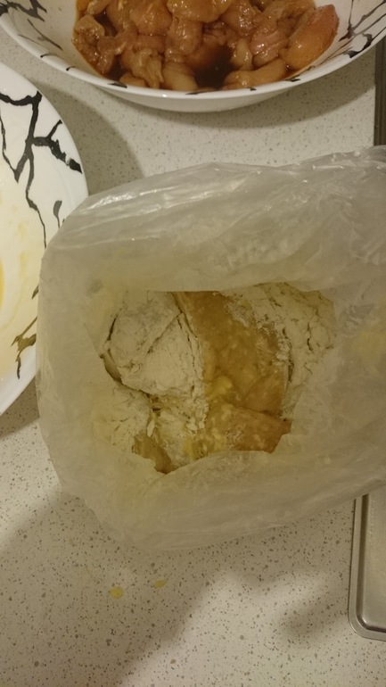 А теперь порциями кусочки курицы панируем в муке. Для этого кладем курицу в пакет с мукой и встряхиваем, потом кусочки перекладываем в лезьон из яиц и опять в муку.