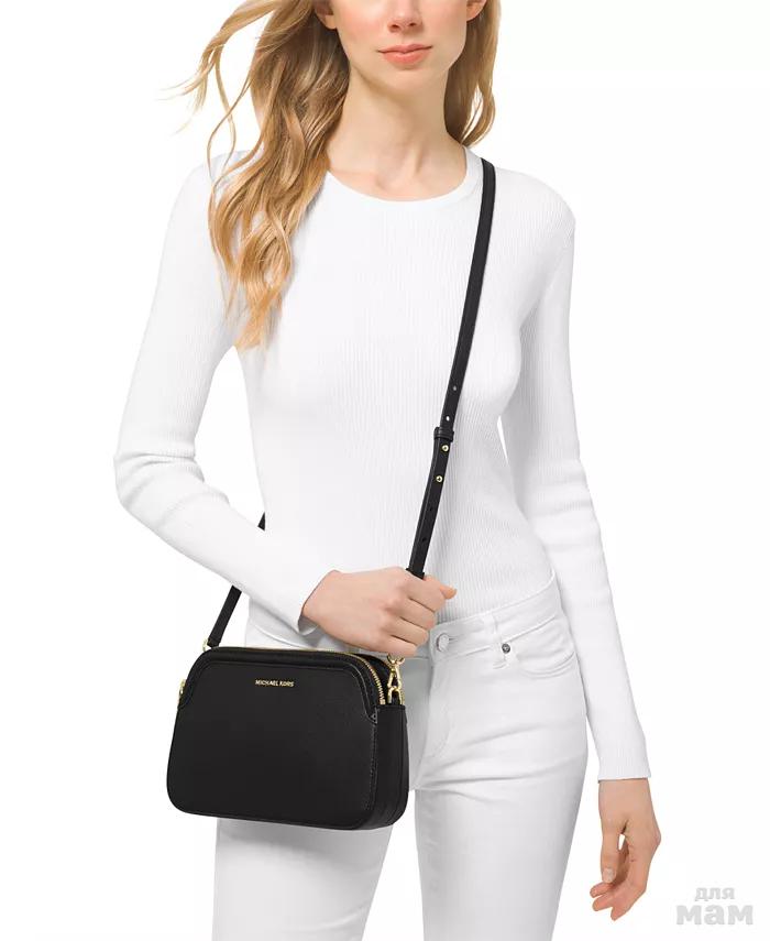 Кожа, два независимых отделения на молнии, третье отделение - на кнопке, много карманов, ремень через плечо.