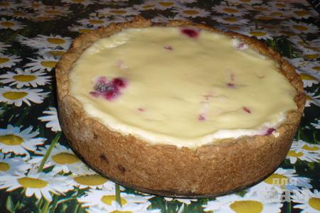 выложи тесто в форму с бортиками. затем творог, сверху любые ягоды, и залей заливкой: сметана + пара яиц + ванильный сахар+ обычный сахар.