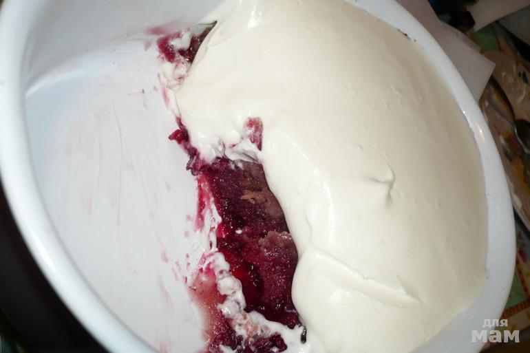 Отсадить, покрывая поверхность крема. Вернуть форму в духовку.