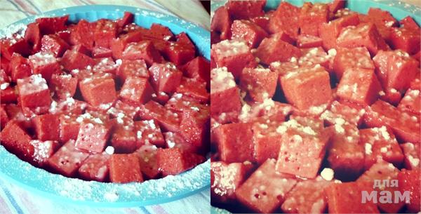 Берем удобную формочку для застывания, кладем в нее вощеную бумагу, а сверху заливаем нашу клубничную массу. Разравниваем и ставим в прохладное место на 5-6 часов для застывания.Застывший клубничный рахат-лукум достаем из формочки, посыпаем сахарной пудрой, нарезаем на кубики и подаем.