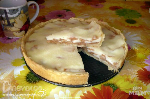 ) Тесто размять в форме, сделав бортики, смазывать ее не надо, тесто не прилипнет. Выложить яблоки, чтобы они легли слоями. 250 грамм сметаны смешать с тремя столовыми ложками сахара, добавить 2-3 пакетика ванильного сахара, столовую ложку крахмала и столовую ложку муки. Вылить смесь на яблоки. Заливка должна быть сладкой и ванильной, если сметана очень густая, можно добавить немного молока или сливок. Печь 45 минут при 200С. Резать когда полностью остынет.