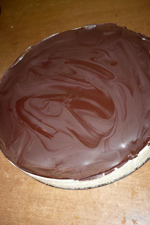 Сразу же выливаем половину суфле на первый корж . Выкладываем второй корж на суфле. И вторую часть суфле полностью выливаем в форму.