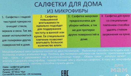 Отличные салфетки из микрофибры для уборки различных поверхностей! Идеально подходят для сухой и влажной уборки. Не оставляют ворсинок и разводов,отлично впитывают воду. Микрофибра не рвется ,не скатывается и приятная на ощупь. Комплект :4 салфетки 30×30 240 руб.