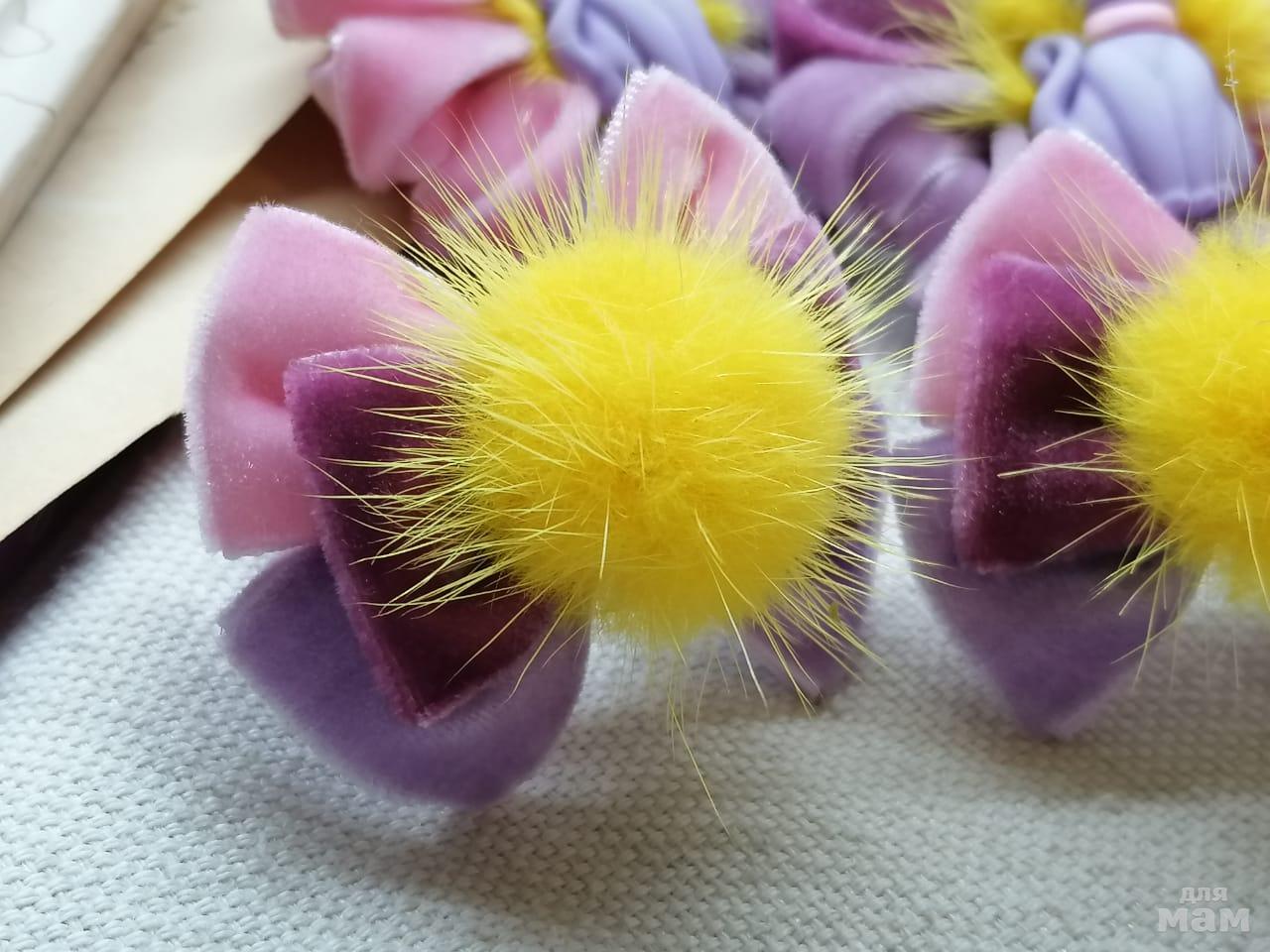 Бархат норка. Размер бантиков 7 см. Понпоны - 5 см. Все на резиночках.