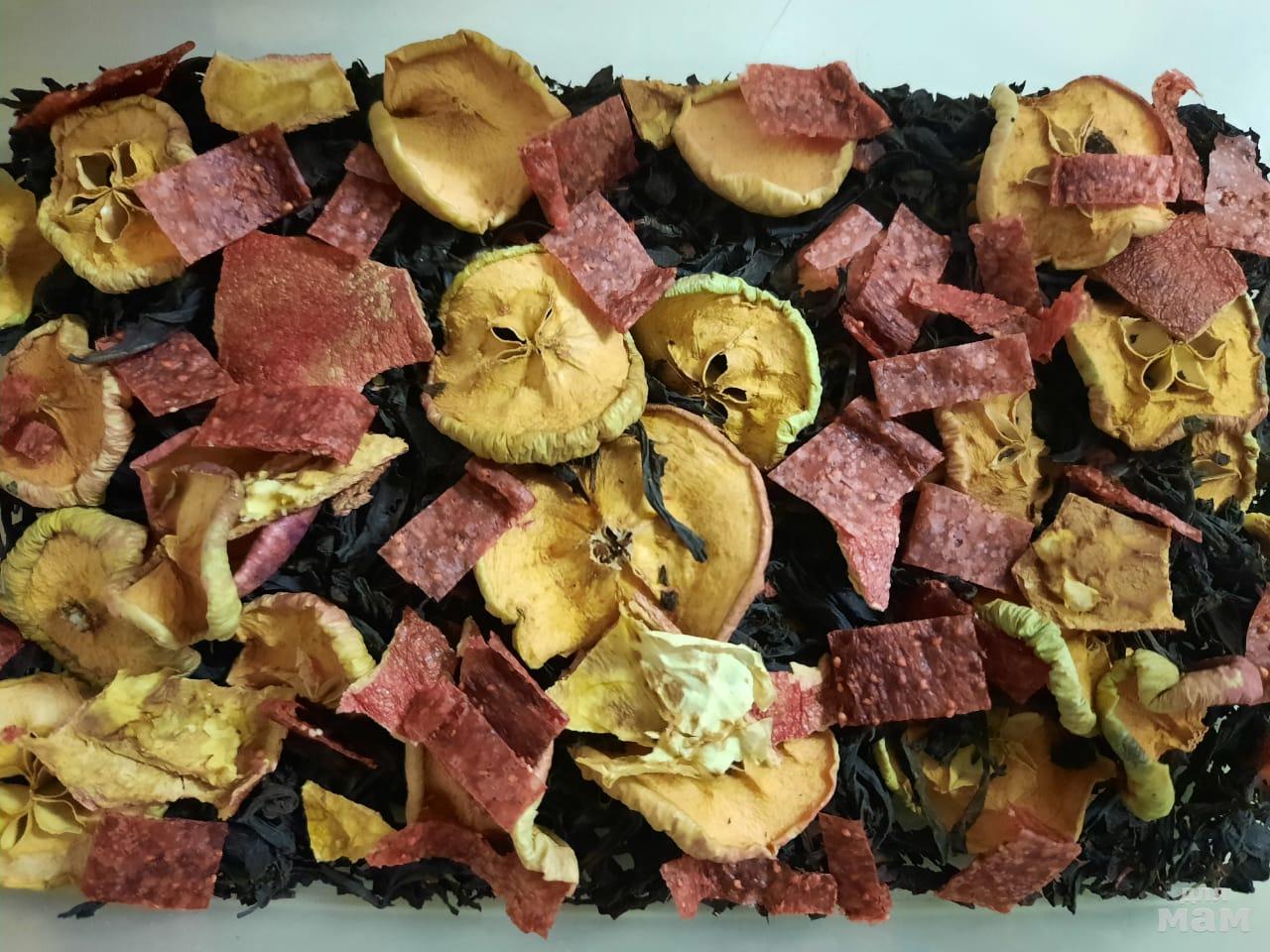 В составе только в основном ягодки! Яблочки, чуть-чуть корочек граната (он очень удачно гармонирует с клубникой) и сама клубничка. Причем в виде пастилы ее гааараааздо больше, чем в ягодках поштучно. Ну, и чай. Черный, зеленый - тут дело вкуса. Чая в этом составе не больше 10%. Максимальная польза в каждой заварке!