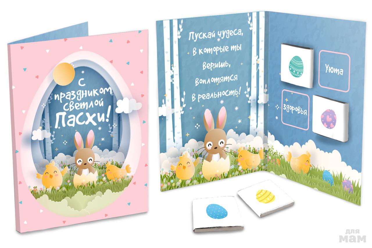 Яркие и современные открытки, внутри которых 4 молочных шоколадки по 5 грамм. Каждая обернута в этикетку с оригинальной иллюстрацией.