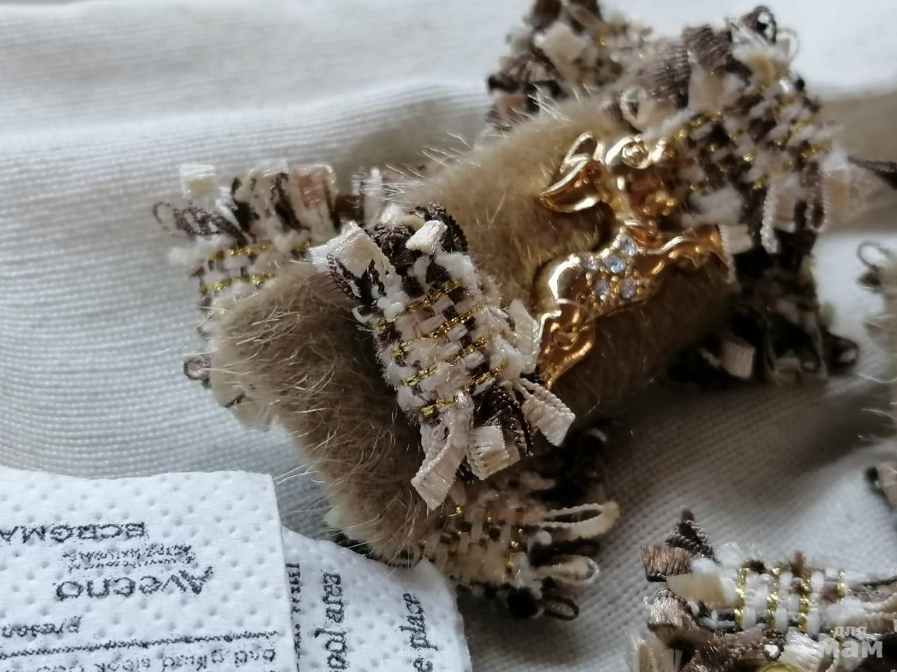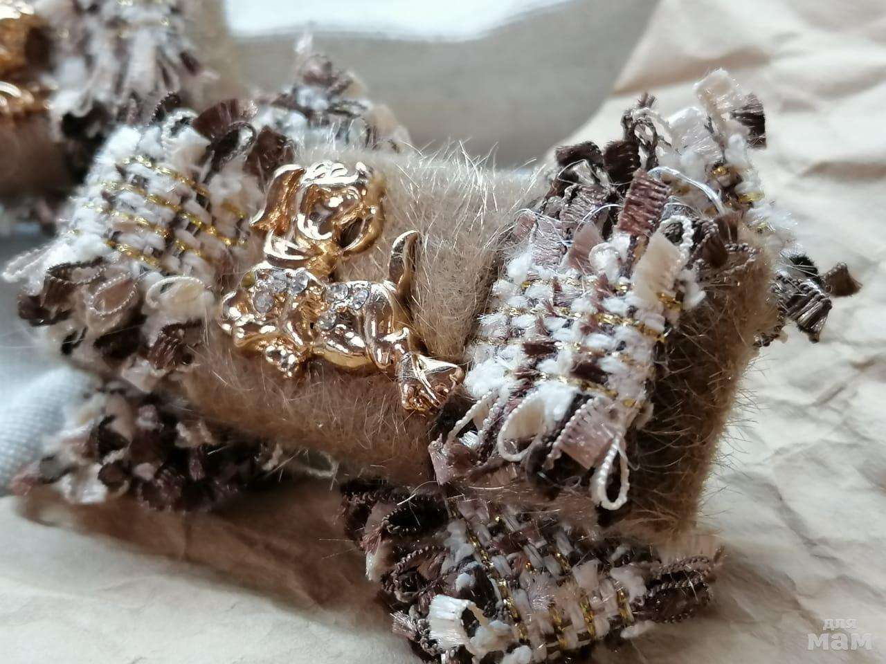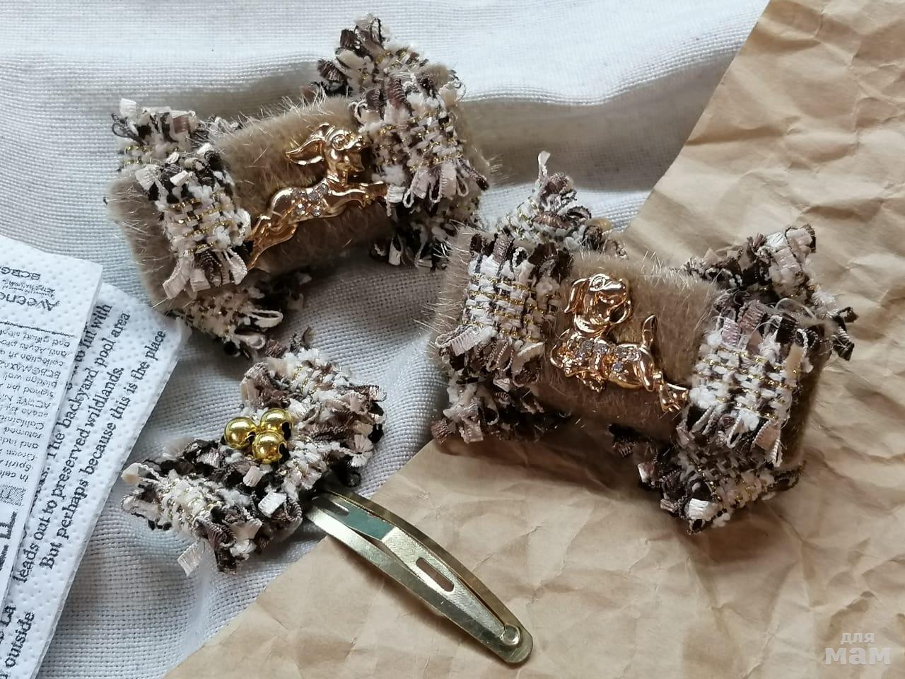 1) Это последние собачки такой серии. Больше нет и не будет. Захотелось им дать достойный домик, поэтому меховая лента и благородный твид. Заколочка в цвет фурнитуры в комплекте.