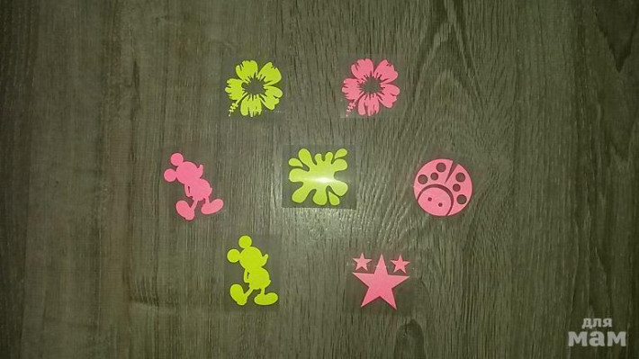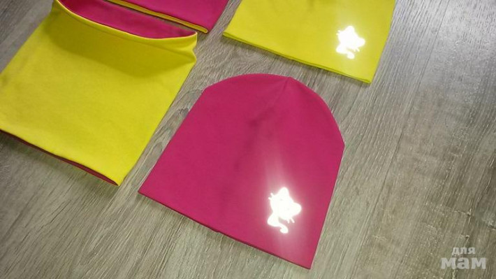 Термотрансферы, пришивные аппликации. Для примера светоотражатели. Есть снуды.