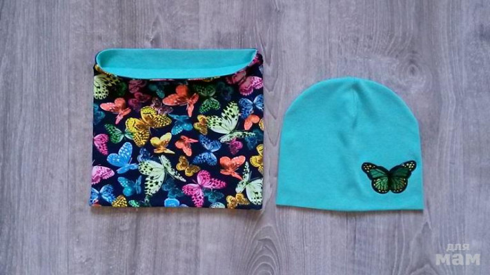 Есть в комплекте снуды однотонные под цвет шапки. Шапочки с нашивкой и без.