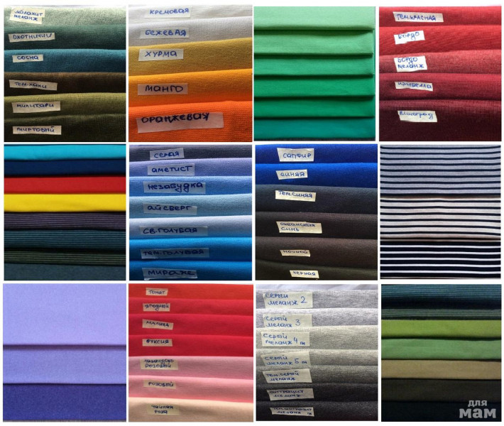 Облегчённый трикотаж ( лето-сентябрь) на фото ниже, есть такие же цвета на осень. По порядку: нежный мятный, минт, св. циклмен, лимон, фуксия, лайм, василёк, потребляется. Это не все цвета. Еще есть св.серый, серый, бирюза яркая, зеленая, морская волна, нежно-розовый светлее, тёмно-синий.