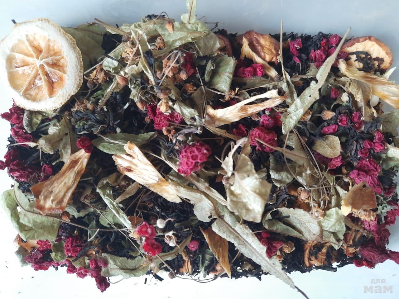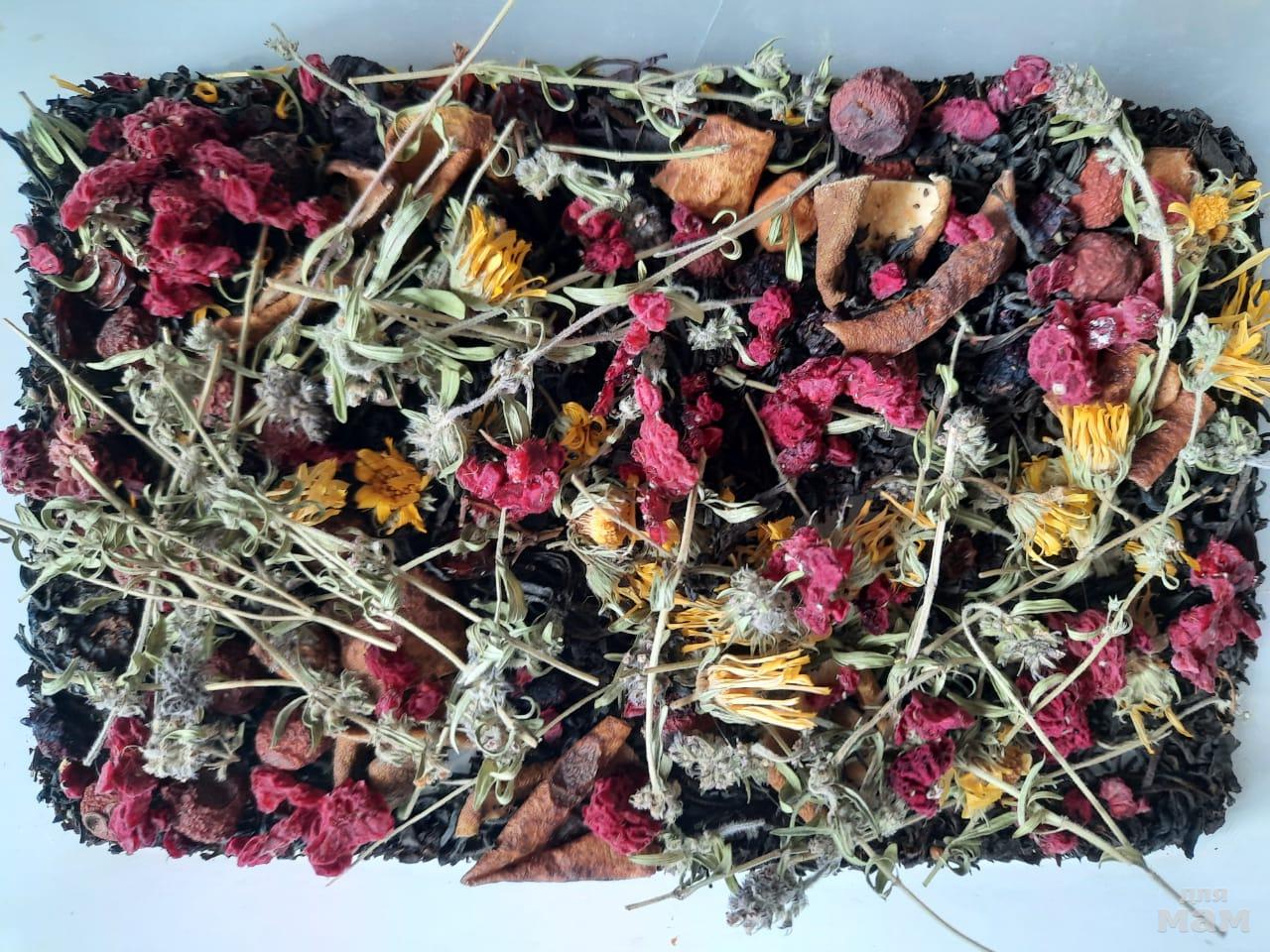 Состав: чабрец, календула, боярышник, лепестки розы, калина, груша лесная, чернослив, клюква, малина, крупнолистовой чай. Чай темный, насыщенный, вкус терпкий.