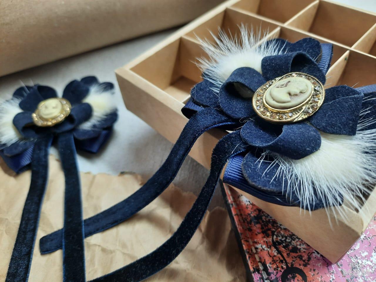 2) В этой модели благородно и достойно все - это и форма, и материал, и украшение. Использован натуральный мех, натуральная замша и бархат. Серединка с кристаллами. Цвет бантов темно-синий. Мех - айвори.