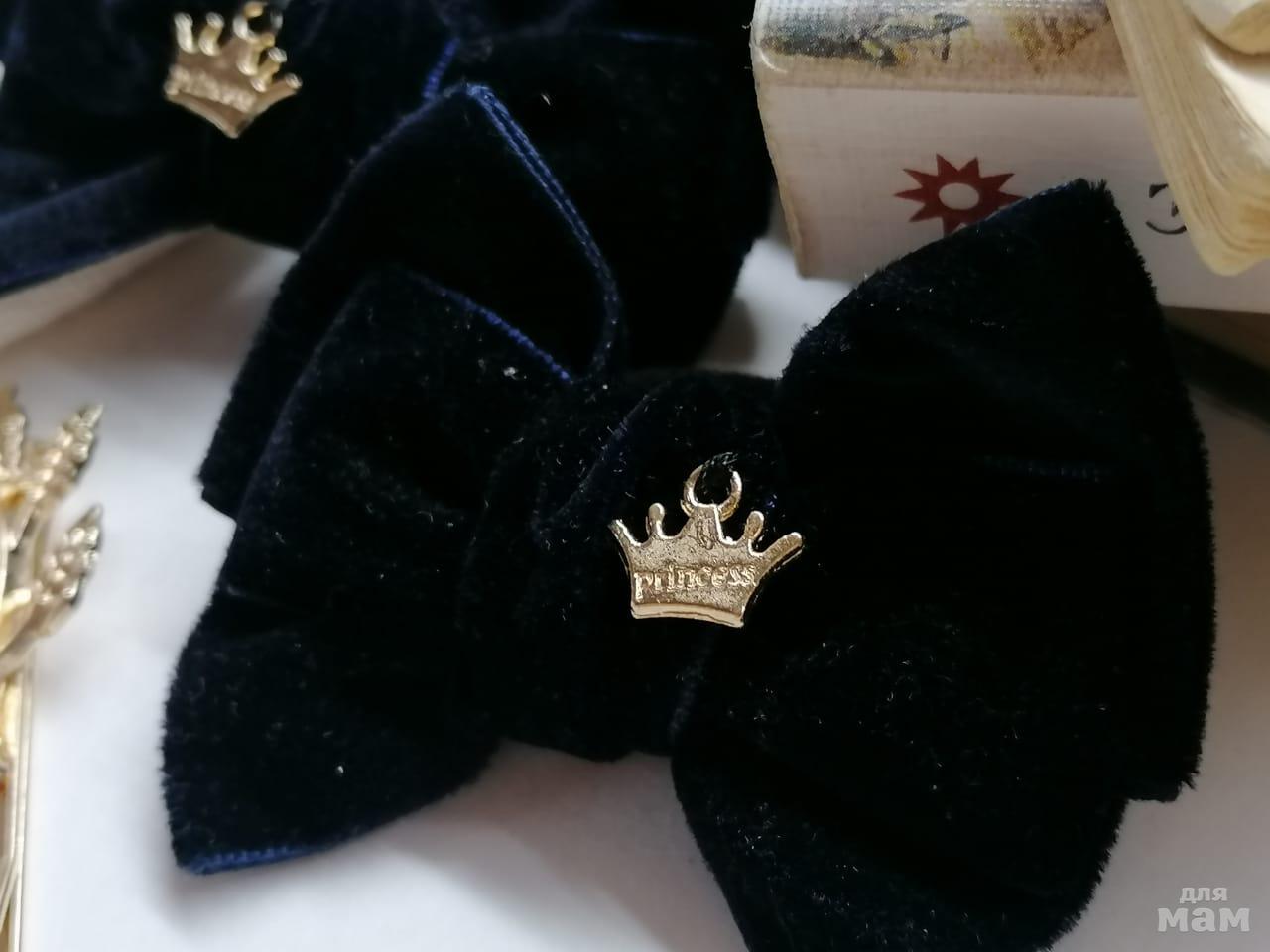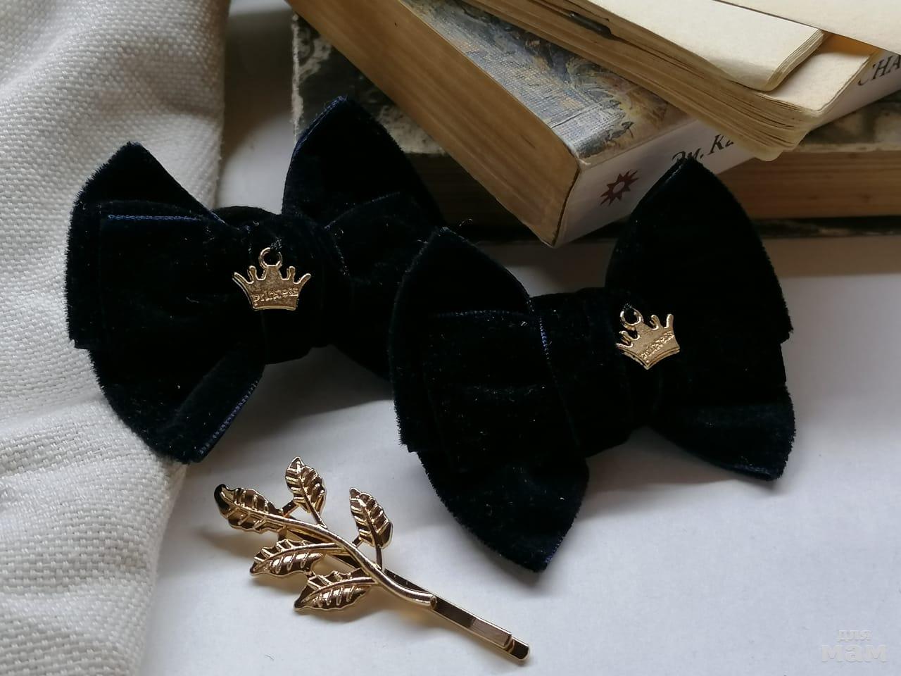 1) Бархатные школьные для тех кто любит минимализм и лаконичность. Цвет бархата ТЕМНО-СИНИЙ. На фото затемнился почему-то. Заколочка в подарок. Есть материал на одни повтор. Размер 6-6,5 см