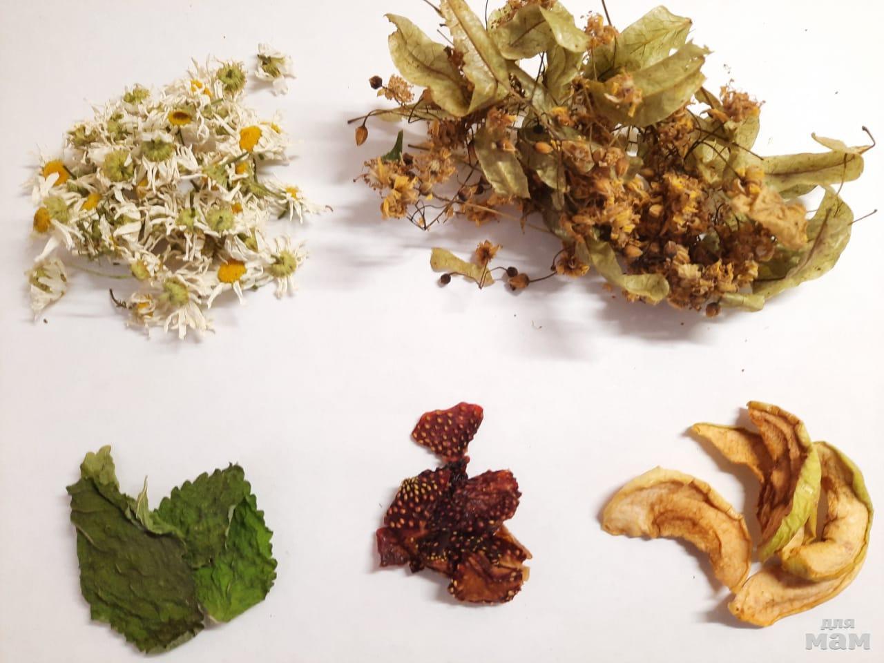 Мой самый-самый любимый состав: ромашка, липа, чуть-чуть мелиссы (что бы она не перебивала тонкий аромат других травок), дольки яблочек и клубничка. Подробно тут