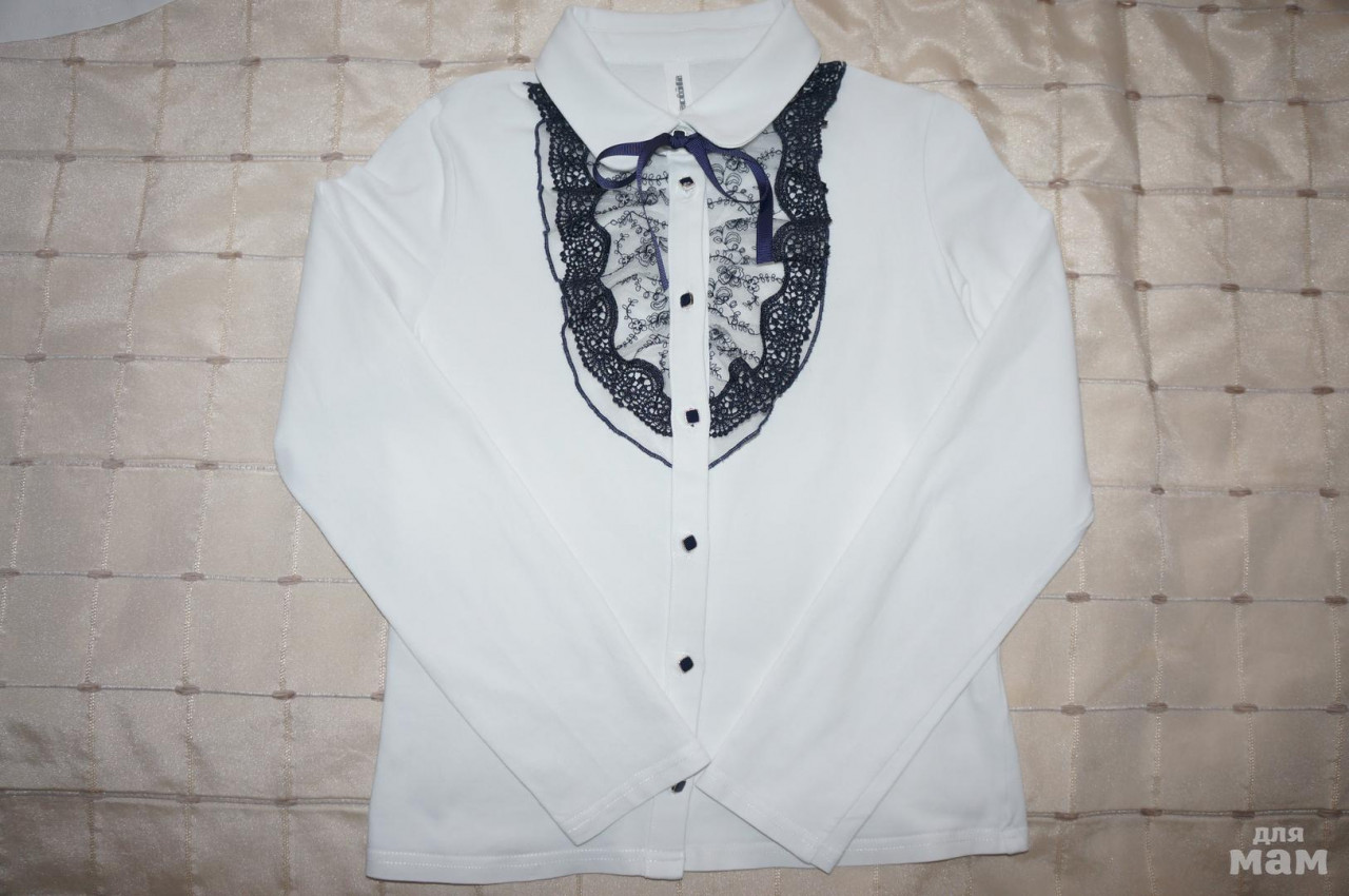5.Блузка белая Nota bene Р.140 с красивым жабо синего цвета , сзади белая трикотажная спинка ,удобная . 1200 руб.В идеале! БРОНЬ!
